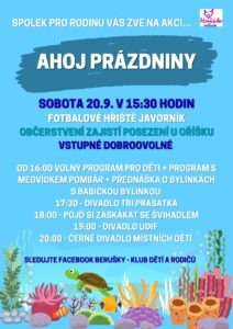16 Zář Ahoj prázdniny Posted at 22:47h in Konalo se by Kristýna Kouřiová 0 Comments Spolek pro Rodinu z.s. Vás srdečně zve na krásné odpoledne plné skvělého programu….přijďte se bavit s námi 🙂 Vstupné dobrovolné Občerstvení připraví Posezení U oříšku. Výtěžek z jídla bude věnovaný dětem z klubu Berušky