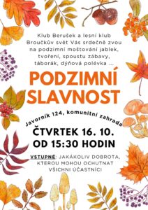 Taky milujete podzim a jeho dary? Tak je tato akce určena přímo pro Vás…Klub Berušky a lesní klub Broučkův svět Vás srdečnou zvou na Podzimní slavnost.